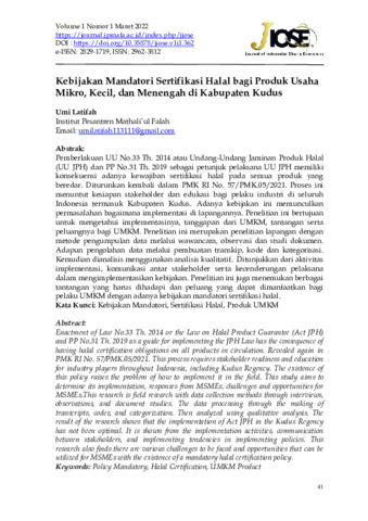 Umi, Latifah (2022) Kebijakan mandatori sertifikasi halal bagi produk Usaha Mikro, Kecil, dan Menengah di Kabupaten Kudus. Journal of Indonesian Sharia Economics, 1 (1): 3. pp. 41-58. ISSN 2962-3812