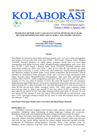 Melyati, Robert (2021) Penerapan metode index card match untuk meningkatkan hasil belajar ekonomi pada siswa Kelas XI IPS 3 SMA Negeri 1 Kupang. Kolaborasi: Jurnal Penelitian Pendidikan dan Pengembangan, 2 (1): 8. pp. 49-58. ISSN 2962-4541