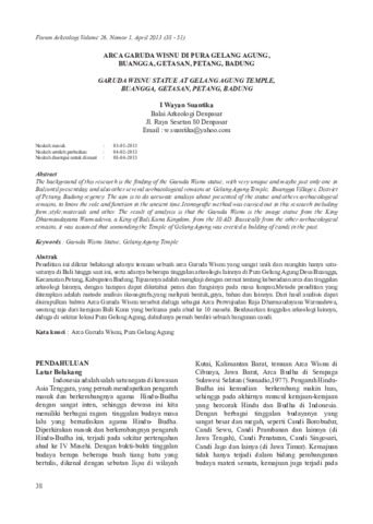 Penelitian ini dilatar belakangi adanya temuan sebuah arca Garuda Wisnu yang sangat unik dan mungkin hanya satu- satunya di Bali hingga saat ini, serta adanya beberapa tinggalan arkeologis lainnya di Pura Gelang Agung Desa Buangga, Kecamatan Petang, Kabupaten Badung. Tujuannya adalah mengkaji dengan cermat tentang keberadaan arca dan tinggalan arkeologi lainnya, dengan harapan dapat diketahui peran dan fungsinya pada masa lampau. Metode penelitian yang diterapkan adalah metode analisis ikonografis,yang meliputi bentuk,gaya, bahan dan lainnya. Dari hasil analisis dapat disimpulkan bahwa Arca Garuda Wisnu tersebut diduga sebagai Arca Perwujudan Raja Dharmaudayana Warmadewa, seorang raja dari kerajaan Bali Kuna yang berkuasa pada abad ke 10 masehi. Berdasarkan tinggalan arkeologi lainnya, diduga di sekitar lokasi Pura Gelang Agung, dahulunya pernah berdiri sebuah bangunan candi