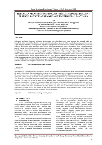 Maria Yuliantina Susanti, Sabebegen and Sutrisari Sabrina, Nainggolan (2022) Hubungan pelatihan dan reward terhadap kinerja perawat di ruang rawat inap rumah sakit umum daerah Banyuasin. Jurnal Kesehatan Bina Husada (Health Journal of Bina Husada), 14 (3): 1. pp. 76-79. ISSN 1829-9377