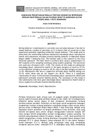 Imam, Arief Mindiono (2022) Hubungan pengetahuan remaja tentang kesehatan reproduksi dengan sikap remaja dalam pacaran sehat di madrasah aliyah negeri (MAN) 1 kota Semarang. MANUJU: MALAHAYATI NURSING JOURNAL, 4 (11): 11. pp. 2982-2992. ISSN 2655-2728
