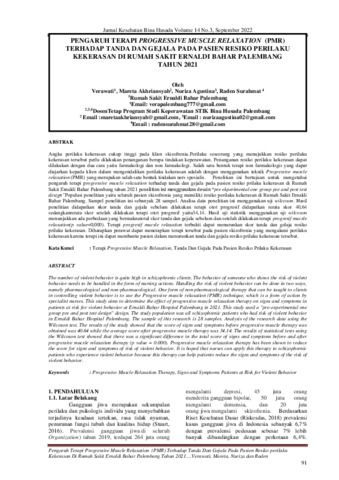 Verawati, Verawati and Mareta, Akhriansyah and Nuriza, Agustina and Raden, Surahmat (2022) Pengaruh terapi Progressive Muscle Relaxation (PMR) terhadap tanda dan gejala pada pasien resiko perilaku kekerasan di rumah sakit Ernaldi Bahar Palembang tahun 2021. Jurnal Kesehatan Bina Husada (Health Journal of Bina Husada), 14 (3): 4. pp. 91-97. ISSN 1829-9377