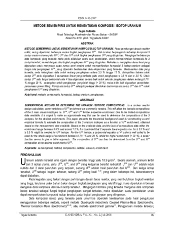 METODE SEMIEMPIRIS UNTUK MENENTUKAN KOMPOSISI ISOTOP URANIUM. Pada perhitungan desain reaktor nuklir, sering diperlukan beberapa variasi tingkat pengkayaan U235. Hal ini akan berpengaruh terhadap komposisi 3 isotop uranium utama yaitu U234, U235 dan U238 untuk tingkat pengkayaan U235 yang diinginkan. Mengingat terbatasnya data komposisi yang tersedia maka perlu dilakukan suatu cara pendekatan, untuk memperkirakan komposisi ke-3 isotop tersebut, sesuai dengan nilai tingkat pengkayaan U235 yang diinginkan. Makalah ini menyajikan dasar teori yang