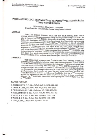 Beberapa aspek perilaku biologi senyawa penyidik tulang 99mTc-MDP (metilen di fosfonat) dan 99mTc-HEDSPA (hidroksi etilen dinatrium fosfonat) pada tikus wistar betina telah diungkapkan dalam laporan ini. Dua kelompok tikus wistar betina masing-masing disuntikkan secara intravena senyawa 99mTc-MDP dan 99mTc-HEDSPA (+- 250 mCi dalam 0,25 ml larutan untuk per ekor tikus). Pada setiap interval waktu tertentu dilakukan pengamatan keradioaktifan jaringan dan organ tikus seperti darah, hati, limpa, ginjal, kelenjar tiroid, kelenjar susu, otot dan tulang. Hasil pengamatan menunjukkan bahwa kandungan 99mTc-MDP pada tulang dan ginjal tikus wistar tampak melampaui harga kandungan 99mTc-HEDSPA pada jaringan dan organ yang sama, sementara keradioaktifan kedua senyawa kompleks tersebut pada darah tikus hampir tidak berbeda banyak. Tingkat kandungan 99mTc-HEDSPA pada kelenjar tiroid tikus wistar cenderung lebih besar dari pada kandungan 99mTc-MDP.