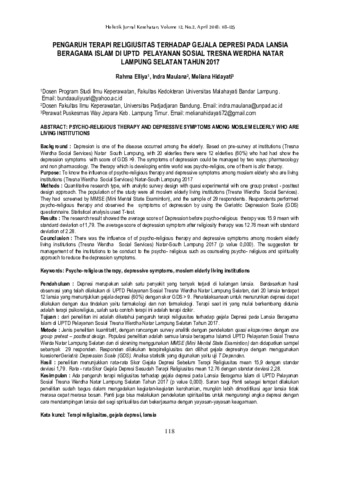 Rahma Elliya and Indra Maulana and Meliana Hidayati Pengaruh terapi religiusitas terhadap gejala depresi pada lansia beragama Islam di UPTD Pelayanan Sosial Tresna Werdha Natar Lampung Selatan tahun 2017. Holistik: Jurnal Kesehatan, 12 (2): 8. pp. 118-125. ISSN 1978-3337
