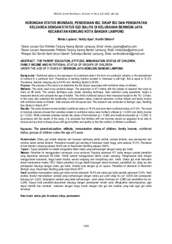 Mindo, Lupiana and Holidy, Ilyas and Kunthi, Oktiani (2018) Hubungan status imunisasi, pendidikan ibu, sikap ibu dan pendapatan keluarga dengan status gizi balita di Kelurahan Beringin Jaya Kecamatan Kemiling Kota Bandar Lampung. Holistik: Jurnal Kesehatan, 12 (3): 2. pp. 146-153. ISSN 1978-3337