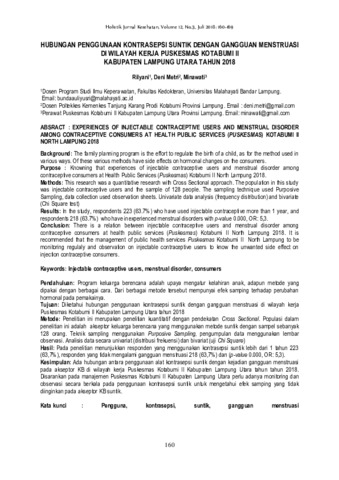 Rilyani, Rilyani and Deni, Metri and Minawati, Minawati (2018) Hubungan penggunaan kontrasepsi suntik dengan gangguan menstruasi di wilayah kerja Puskesmas Kotabumi II Kabupaten Lampung Utara tahun 2018. Holistik: Jurnal Kesehatan, 12 (3): 4. pp. 160-169. ISSN 1978-3337