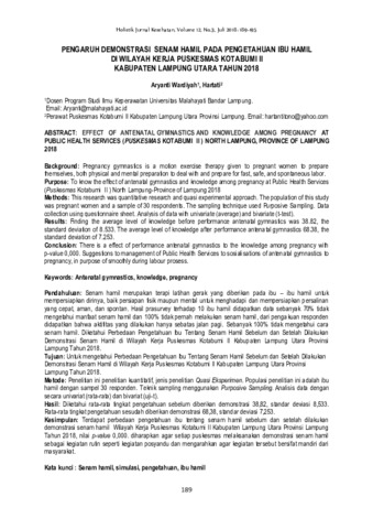 didapatkan bahwa aktifitas yang dilakukan hanya sebatas jalan pagi. Sebanyak 100% tidak mengetahui cara senam hamil. Diketahui Perbedaan Pengetahuan Ibu Tentang Senam Hamil Sebelum dan Setelah Dilakukan Demonstrasi Senam Hamil di Wilayah Kerja Puskesmas Kotabumi II Kabupaten Lampung Utara Provinsi Lampung Tahun 2018. Tujuan: Untuk mengetahui Perbedaan Pengetahuan Ibu Tentang Senam Hamil Sebelum dan Setelah Dilakukan Demonstrasi Senam Hamil di Wilayah Kerja Puskesmas Kotabumi II Kabupaten Lampung Utara Provinsi