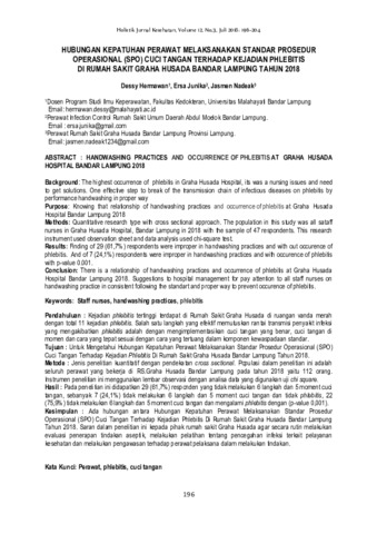 Dessy, Hermawan and Ersa, Junika and Jasmen, Nadeak (2018) Hubungan kepatuhan perawat melaksanakan Standar Prosedur Operasional (SPO) cuci tangan terhadap kejadian Phlebitis di rumah sakit Graha Husada Bandar Lampung tahun 2018. Holistik: Jurnal Kesehatan, 12 (3): 8. pp. 196-204. ISSN 1978-3337