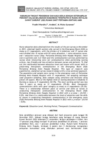 Fradini, Wandira and Andoko, Andoko and M. Ricko, Gunawan (2022) Hubungan tingkat pendidikan dan masa kerja dengan keterampilan perawat dalam melakukan komunikasi terapeutik di ruang instalasi gawat darurat (IGD) rumah sakit Pertamina Bintang Amin. MANUJU: MALAHAYATI NURSING JOURNAL, 4 (11): 25. pp. 3155-3167. ISSN 2655-2728