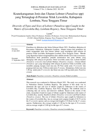 Lasmi, Lasmi (2022) Keanekaragaman jenis dan ukuran lobster (Panulirus spp) yang tertangkap di Perairan Teluk Lewoleba, Kabupaten Lembata, Nusa Tenggara Timur. Jurnal Perikanan dan Kelautan, 27 (3): 16. pp. 382-385. ISSN 0853-7607