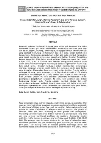Evanny, Indah Manurung and Martina, Pakpahan and Eva Chris, Veronica Gultom and Deborah, Siregar and Peggy S., Tahulending (2022) Orang tua peduli gizi balita di masa pandemi. Jurnal Kreativitas Pengabdian kepada Masyarakat, 5 (11): 1. pp. 3707-3719. ISSN 2615-0921