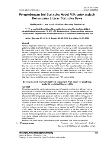Nielda Junika and Nur Izzati and Linda Rosmery Tambunan (2020) Pengembangan soal statistika model PISA untuk melatih kemampuan literasi statistika siswa. Mosharafa: Jurnal Pendidikan Matematika, 9 (3): 13. pp. 499-510. ISSN 2086-4280