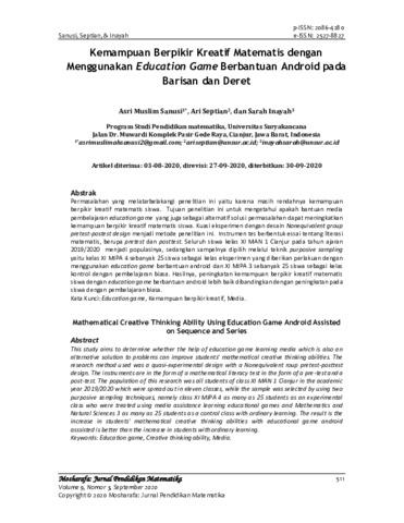 Asri Muslim Sanusi and Ari Septian and Sarah Inayah (2020) Kemampuan berpikir kreatif matematis dengan menggunakan education game berbantuan android padabarisan dan deret. Mosharafa: Jurnal Pendidikan Matematika, 9 (3): 14. pp. 511-520. ISSN 2086-4280