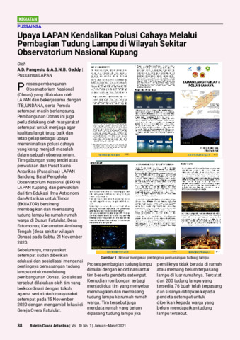 Ayu Dyah Pangestu and Aullya Shabillina Napaulin Bona Geddy (2021) Upaya LAPAN kendalikan polusi cahaya melalui pembagian tudung lampu di wilayah sekitar Observatorium Nasional Kupang. Buletin Cuaca Antariksa, 10 (1): 15. pp. 38-39. ISSN 2303-2707