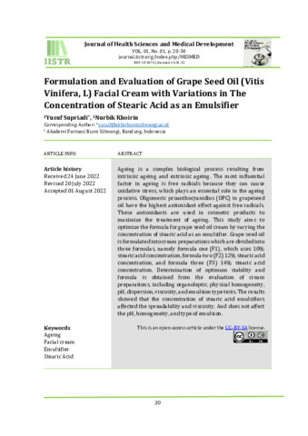 Yusuf, Supriadi and Nurbik, Khoirin (2022) Formulation and evaluation of grape seed oil (Vitis Vinifera, L) facial cream with variations in the concentration of stearic acid as an emulsifier. Journal of health sciences and medical development, 1 (1): 3. pp. 20-30. ISSN ISSN 2962-5769