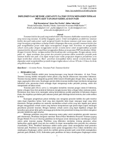 Puji Karuniawan and Intan NFarida and Julian Suhertian (2021) Implementasi metode certainty factor untuk mengidentifikasi penyakit tanaman kedelai dan padi. Nusantara of Engineering: Jurnal Ilmiah Fakultas Teknik Univ. Nusantara PGRI Kediri, 4 (1): 1. pp. 1-9. ISSN 2355-6684