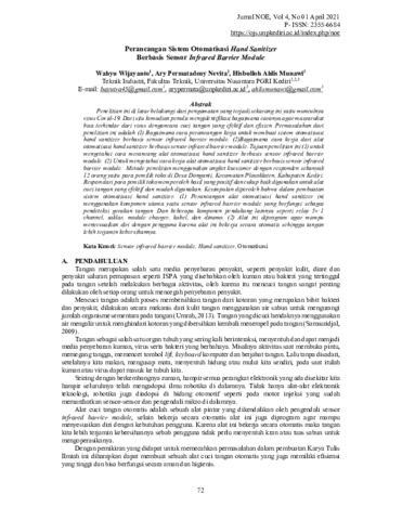 Wahyu, Wijayanto and Ary Permatadeny, Nevita and Hisbulloh Ahlis, Munawi (2021) Perancangan sistem otomatisasi hand sanitizer berbasis sensor infrared barrier module. Nusantara of Engineering: Jurnal Ilmiah Fakultas Teknik Univ. Nusantara PGRI Kediri, 4 (1): 9. pp. 72-80. ISSN 2355-6684