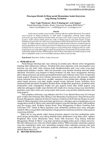Fajar Teguh, Wicaksono and Resty, Wulaningrum and Ardi, Sanjaya (2021) Penerapan metode K-Mean untuk menentukan sanksi karyawan yang datang terlambat. Nusantara of Engineering: Jurnal Ilmiah Fakultas Teknik Univ. Nusantara PGRI Kediri, 4 (1): 11. pp. 89-97. ISSN 2355-6684