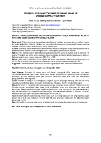 | Uncontrolled Keywords: | kecacingan; Kadar hemoglobin dan indeks massa tubuh |