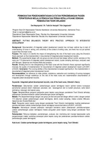 Dwi, Nopriyanto and Rr. Tutik Sri, Hariyati and Titin, Ungsianik (2019) Peningkatan pendokumentasian catatan perkembangan pasien terintegrasi melalui penguatan peran kepala ruang dengan pendekatan teori Orlando. Holistik: Jurnal Kesehatan, 13 (1): 3. pp. 19-28. ISSN 1978-3337