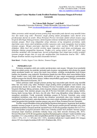 Ivo Colanus Rally Drajana and Andi Bode (2021) Support Vector Machine untuk prediksi produksi tanaman pangan di Provinsi Gorontalo. Nusantara of Engineering: Jurnal Ilmiah Fakultas Teknik Univ. Nusantara PGRI Kediri, 4 (2): 2. pp. 104-111. ISSN 2355-6684