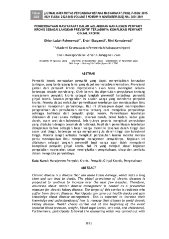 Dhian Luluh Rohmawati and Endri Ekayamti and Rini Komalawat (2022) Pemberdayaan masyarakat dalam melakukan manajemen penyakit kronis sebagai langkah preventif terjadinya komplikasi penyakit ginjal kronik. Jurnal Kreativitas Pengabdian kepada Masyarakat, 5 (11): 12. pp. 3831-3841. ISSN 2615-0921
