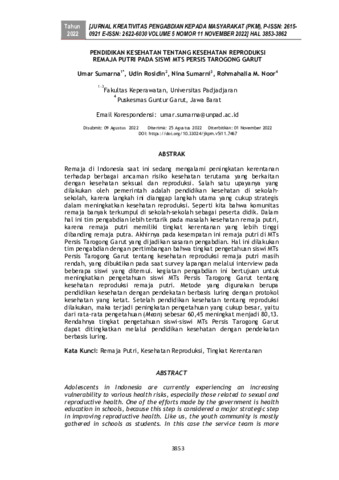 Umar Sumarna and Udin Rosidin and Nina Sumarni and Rohmahalia M. Noor (2022) Pendidikan kesehatan tentang kesehatan reproduksi remaja putri pada siswi MTS Persis Tarogong Garut. Jurnal Kreativitas Pengabdian kepada Masyarakat, 5 (11): 14. pp. 3853-3862. ISSN 2615-0921