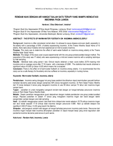 Hardono, Hardono and Elisa, Oktaviana and Andoko, Andoko (2019) Rendam kaki dengan air hangat salah satu terapi yang mampu mengatasi insomnia pada lansia. Holistik: Jurnal Kesehatan, 13 (1): 8. pp. 62-68. ISSN 1978-3337