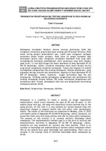 Tatik Trisnowati (2022) Peningkatan pengetahuan ibu tentang menopause di Desa Ngemplak Mojosongo Surakarta. Jurnal Kreativitas Pengabdian kepada Masyarakat, 5 (11): 15. pp. 3863-3872. ISSN 2615-0921