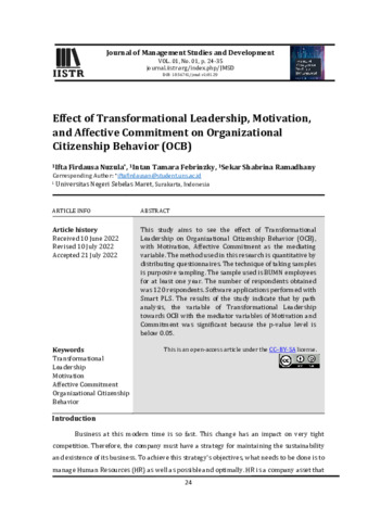 Ifta Firdausa Nuzula and Intan Tamara Febrinzky and Sekar Shabrina Ramadhany (2022) Effect of transformational leadership, motivation, and affective commitment on Organizational Citizenship Behavior (OCB). Journal of management studies and development, 1 (1): 3. pp. 24-35. ISSN 2962-5955