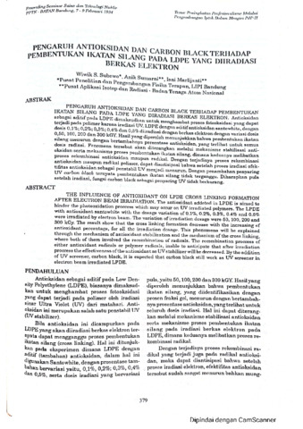 Antioksidan sebagai aditif pada LDPE dimaksudkan untuk menghambat proses fotooksidasi yang dapat terjadi pada polimer karena iradiasi UV. LDPE dengan aditif antioksidan santowhite, dengan dosis 0,1%;0,2%;0,3%;0,4% dan 0,5% diiradiasi dengan berkas elektron dengan variasi dosis 0,50,100,200 dan 300 kGY. Hasil yang diperoleh menunjukkan bahwa pembentukan ikatan silang menurun dengan bertambahnya persentase antioksidan, yang terlihat untuk semua dosis radiasi. Fenomena tersebut akan diterangkan melalui mekanisme stabilisasi antioksidan serta mekanisme proses pembentukan ikatan silang, dimana keduanya melibatkan proses rekombinasi antioksidan maupun radikal. Dengan terjadinya proses rekombinasi antioksidan maupun radikal polimer, dapat diantisipasi bahwa setelah proses iradiasi efektivitas antioksidan sebagai penstabil UV menjadi menurun. Dengan penambahan UV penyaring carbon black ternyata pembentukan ikatan silang tidak terganggu. Diharapkan pula setelah iradiasi, fungsi carbon black sebagai penyaring UV tidak berkurang.