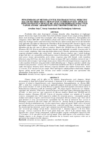 Perubahan iklim akan berpengaruh terhadap dinamika siklus biogeokimia di lingkungan akuatik. Determinasi logam berat dalam biota baik tumbuhan maupun hewan sangat penting dilakukan dalam studi limnologis terlebih bila menyangkut siklus biogeokimia, bioakumulasi, biomagnifikasi dan sebagainya. Tahun 2006-2007, telah dilakukan sebuah studi untuk menentukan methoda ekstraksi hasil adopsi dari berbagai sumber untuk determinasi Total Mercury dalam matriks biota hewan dan tumbuhan yang applicable diterapkan di laboratorium Hidrokimia Puslit Limnologi-LIPI. Instrumen digester yang digunakan adalah hotplate, waterbath, dan autoclave. Sedangkan instrument berbasis CVAAS yangdigunakan ada dua type yaitu (1) Mercury Analyzer Hitachi type 180-0450 dan (2) Mercury Analyzer Hiranuma HG-310. Kriteria pemilihan methoda ekstraksi yang applicable ini adalah besarnya nilai % recovery analit, singkatnya waktu yang diperlukan dalam proses ekstraksi, optimumnya tingkat konsumsi reagensia oksidator-reduktor dan energi listrik. Instrumen Mercury Analyzer type 1 masih berfungsi dengan baik dari sisi repeatability pembacaannya namun kelemahannya adalah lebih lama dan lebih rumit proses inisiasi operasionalnya, perlu volume reagensia yang lebih banyak, resiko terjadinya kebocoran yang lebih besar dan limit deteksi hanya mencapai 0,05 mg/L sebaliknya instrument type 2 limit deteksi alat mencapai 1 ng/L dengan inisiasi proses hanya 30 menit dengan konsumsi reagensia dan resiko terjadinya kebocoran yang jauh lebih rendah dibanding type 1. Digester autoclave adalah yang terbaik (rerata prosentase recovery 101.25 % untuk biota tumbuhan dan 102.52 % untuk biota hewan), waktu total digesti, konsumsi listrik, konsumsi reagensia oksidator dan reduktor berturut-turut hanya 17.14 menit, 18,18 watt dan 8 mL per sample. Water bath digester adalah pilihan terbaik kedua. Hotplate digester paling murah pada saat investasi awal namun termahal pada saat operasional bila dibandingkan kedua digester lainnya.