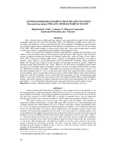 Djamhuriyah, S. Said and Lukman, Lukman and Novi, Mayasari and Supranoto, Supranoto and Syahroma, Husni Nasution and Triyanto, Triyanto (2008) Antisipasi degradasi habitat ikan pelangi Sulawesi Marosatherina ladigesi melalui aplikasi habitat ex-situ. In: Prosiding Seminar Nasional Limnologi IV, IPB International Convention Center, Bogor.