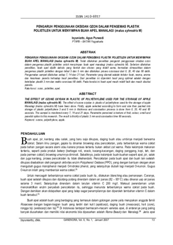 Isyuniarto, Isyuniarto and Purwadi, Agus (2007) PENGARUH PENGGUNAAN OKSIDAN OZON DALAM PENGEMAS PLASTIK POLIETILEN UNTUK MENYIMPAN BUAH APEL MANALAGI (malus sylvestris M). Ganendra, 10 (1). pp. 13-18. ISSN p-ISSN: 1410-6957, e-ISSN: 2503-5029