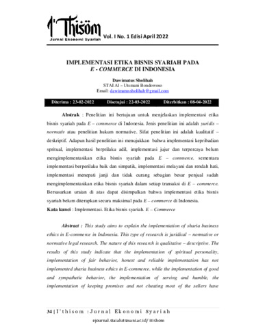 Dawimatus, Sholihah (2022) Implementasi etika bisnis syariah pada e - commerce di Indonesia. I’thisom: Jurnal ekonomi syariah, 1 (1): 3. pp. 34-51. ISSN 2963-1653