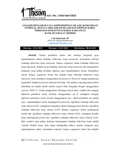 Cuk, Sugiartono (2022) Analisis pengaruh gaya kepemimpinan islami, komunikasi internal, budaya organisasi islami dan disiplin kerja terhadap efektivitas kerja karyawan Bank Muamalat Jember. I’thisom: Jurnal ekonomi syariah, 1 (1): 4. pp. 52-67. ISSN 2963-1653