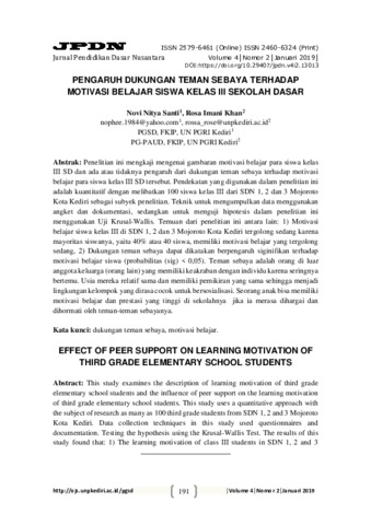 Novi Nitya, Santi and Rosa Imani, Khan (2019) Pengaruh dukungan teman sebaya terhadap motivasi belajar siswa kelas III sekolah dasar. Jurnal Pendidikan Dasar Nusantara, 4 (2): 8. pp. 191-198. ISSN 2460-6324