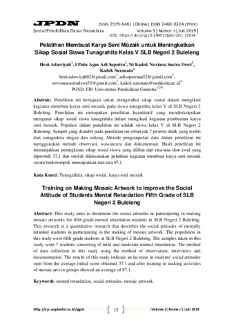 Heni, Adawiyah and I Putu Agus Adi, Saputra and Ni Kadek Noviana Sastra, Dewi and Kadek, Suranata (2019) Pelatihan membuat karya seni mozaik untuk meningkatkan sikap sosial siswa tunagrahita kelas V SLB Negeri 2 Buleleng. Jurnal Pendidikan Dasar Nusantara, 5 (1): 2. pp. 15-24. ISSN 2460-6324