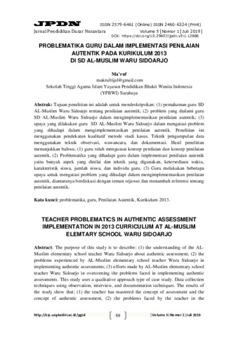 Ma’ruf, Ma’ruf (2019) Problematika guru dalam implementasi penilaian autentik pada kurikulum 2013 di SD Al-Muslim Waru Sidoarjo. Jurnal Pendidikan Dasar Nusantara, 5 (1): 8. pp. 88-107. ISSN 2460-6324