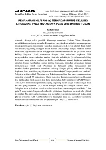 Saeful, Mizan (2019) Pemahaman nilai phi (π) terhadap rumus keliling lingkaran pada mahasiswa PGSD 2018 Unirow Tuban. Jurnal Pendidikan Dasar Nusantara, 5 (1): 9. pp. 108-116. ISSN 2460-6324