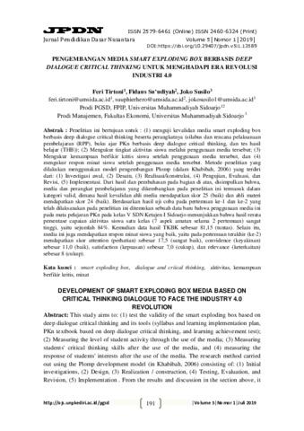 Feri, Tirtoni and Fidaus, Su’udiyah and Joko, Susilo (2019) Pengembangan media smart exploding box berbasis deep dialogue critical thinking untuk menghadapi era revolusi industri 4.0. Jurnal Pendidikan Dasar Nusantara, 5 (1): 15. pp. 191-204. ISSN 2460-6324