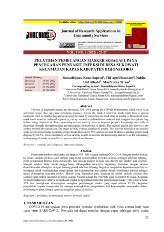 Romadhiyana, Kisno Saputri and Titi, Agni Hutahaen and Nabila, Ulul Albabi and Musfirotun, Ni’am (2022) Pelatihan pembuangan masker sebagai upaya pencegahan penyakit infeksi di desa Sukowati Kecamatan Kapas Kabupaten Bojonegoro. Journal of Research Applications in Community Service, 1 (1): 4. pp. 23-27. ISSN 2963-9271
