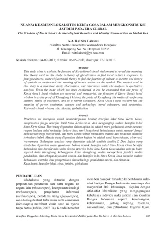 A.A. Rai, Sita Laksmi (2013) Nuansa kearifan lokal situs Kerta Gosa dalam mengkonstruksi jatidiri pada era global. Forum Arkeologi, 26 (3): 3. pp. 207-216. ISSN 0854-3232