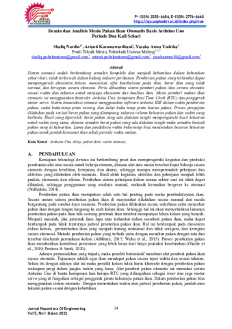 Shafiq, Nurdin and Arianti, Kusumawardhani and Yasaka Arma, Yudrika (2022) Desain dan analisis mesin pakan ikan otomatis basis Arduino Uno periode dua kali sehari. Nusantara of Engineering: Jurnal Ilmiah Fakultas Teknik Univ. Nusantara PGRI Kediri, 5 (1): 5. pp. 34-40. ISSN 2355-6684