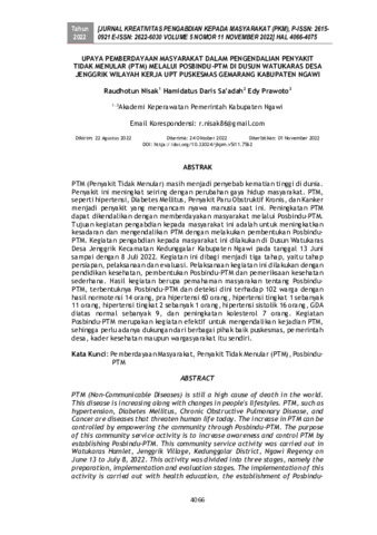 Raudhotun Nisak and Hamidatus Daris Sa’adah and Edy Prawoto (2022) Upaya pemberdayaan masyarakat dalam pengendalian Penyakit Tidak Menular (PTM) melalui POSBINDU-PTM di Dusun Watukaras Desa Jenggrik wilayah kerja UPT PUSKESMAS Gemarang Kabupaten Ngawi. Jurnal Kreativitas Pengabdian kepada Masyarakat, 5 (11): 33. pp. 4066-4075. ISSN 2615-0921