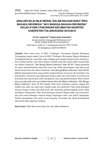Novita, Anggraini and Nugrananda, Janattaka (2020) Analisis nilai-nilai moral dalam bacaan buku teks bahasa Indonesia “Aku Bangga Bahasa Indonesia” Kelas III SDN 3 Padangan Kecamatan Ngantru Kabupaten Tulungagung 2018/2019. Jurnal Pendidikan Dasar Nusantara, 5 (2): 2. pp. 187-201. ISSN 2460-6324