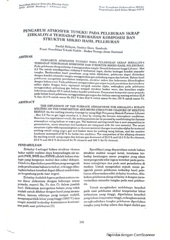 pada peleburan skrap zirkaloy-4 menggunakan tungku remelt frekuensi tinggi lifumat-met 3,3 Vac untuk mendapatkan zirkaloy-4 berbentuk ingot, dicoba berbagai kondisi atmosfer tungku. Berdasarkan hasil percobaan yang telah dilakukan, peleburan dapat dilakukan dengan kondisi atmosfer tungku dengan menggunakan gas pelindung argon dan helium. Bahan hasil peleburan mengalami perubahan komposisi, struktur mikro dan kekerasan dibandingkan dengan bahan awal. pada peleburan menggunakan gas argon terjadi perubahan dari struktur mikro alpha dengan butir equiaxial menjadi acicular alpha, sedangkan pada peleburan menggunakan pelindung gas helium menjadi struktur basket wave, dan kenaikan angka kekerasan sebesar 36% untuk kedua kondisi peleburan. Penurunan komposisi unsur pemadu pada bahan hasil peleburan menggunakan gas argon dan helium masing-masing sebesar 23,8% dan 13,3% untuk unsur Sn 23,3% dan 26,6% untuk unsur Fe dan 100% untuk unsur Cr.