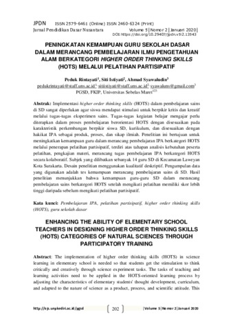 Peduk Rintayati and Siti Istiyati and Ahmad Syawaludin (2020) Peningkatan kemampuan guru sekolah dasar dalam merancang pembelajaran Ilmu Pengetahuan Alam berkategori Higher Order Thinking Skills (HOTS) melalui pelatihan partisipatif. Jurnal Pendidikan Dasar Nusantara, 5 (2): 3. pp. 202-210. ISSN 2460-6324