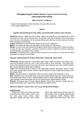 Niken Yuniar, Sari and Sri, Maryuni (2019) Peningkatan harga diri melalui intervensi cognitive behavioral therapy pada remaja korban bullying. Holistik: Jurnal Kesehatan, 13 (4): 1. pp. 270-277. ISSN 1978-3337